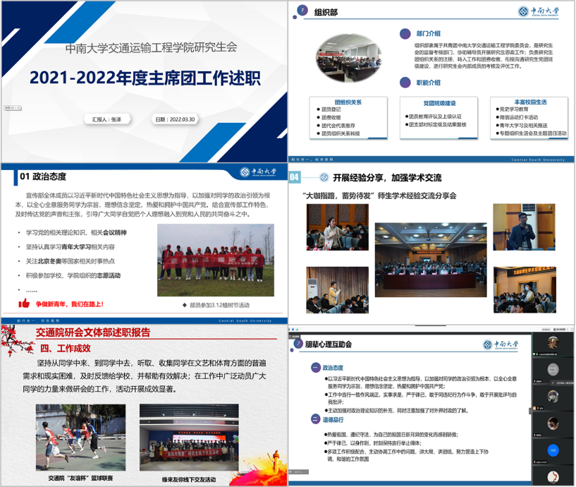 3月30日下午2点30分,交通院分团委、学生会及研究生会述职评议会以线上腾讯会议的形式召开。本次会议由学生会主席罗阿彤主持,学院分团委书记任琭老师,分团委副书记张健老师、郑繁简老师,分团委、学生会、研究生会...