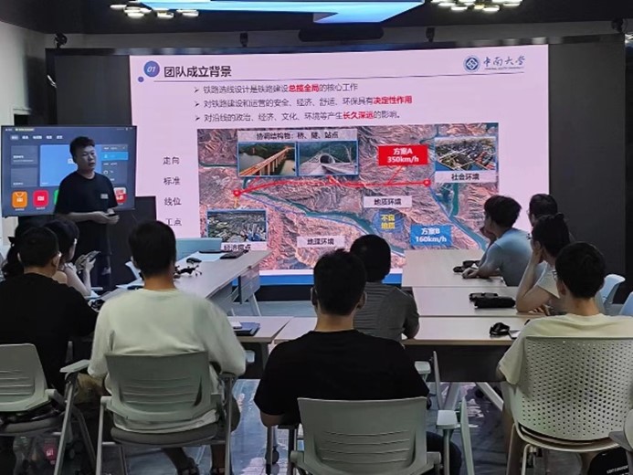 詹振炎教授带领团队开创了铁路数字选线研究领域。当时计算机仍未普及,老一辈科研工作者早出晚归,借用解放军计算所的电子计算机进行研究,最终研发出中国第一套铁路线路平纵面优化和辅助设计系统。通过讲解,同志们了解到,如今中南数智线站研究团队秉承了老一辈“顶天立地”的科研精神,研发出真正解决行业重大需求的产品,推动选线技术从人工二维设计向三维数字智能设计的变革。讲解结束后众多同志对该研究表达兴趣并积极提问。