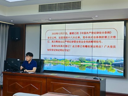 6月29日晚19:00,交通设备与控制工程第一学生党支部在交通楼425开展了“学好用好《条例》,守住守牢初心”党纪学习教育主题党课,对2023年12月27日新修订的《中国共产党纪律处分条例》进行了全面的学习,本次党课由支部书记郑繁简讲授,党支部全体同志参加。