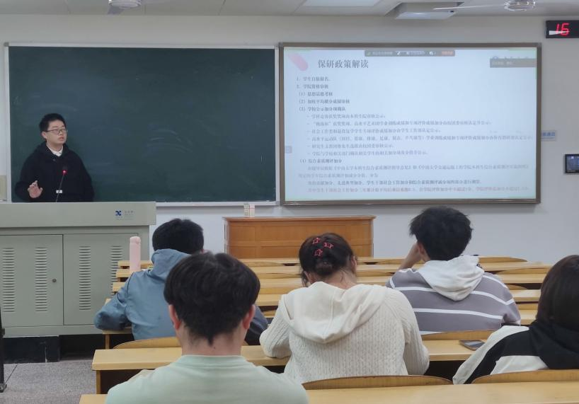 最后则是成功通过国优计划选拔的朱佳莹同学,她向同学们详细介绍了“什么是国优计划”,它的报名要求、与其它保研途径的差异及未来发展方向等,让同学们更熟悉这一条保研途径。不仅如此,朱佳莹同学还向同学们分享了她自己总结出的面试技巧,可能会遇到的问题及对应的处理方法等。