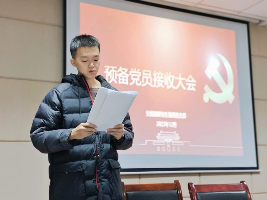 12月7日晚19:00,研究生第四党支部在交通楼513举行预备党员接收大会,讨论接收新一批发展对象为预备党员。支部书记王鸿亿主持会议,支部全体党员参与会议。