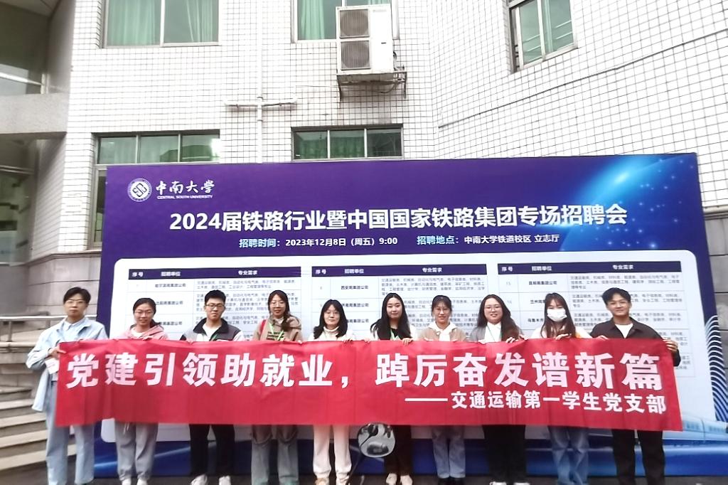 12月8日—9日,交通运输第一学生党支部开展“党建引领助就业,踔厉奋发谱新篇”主题党日活动,支部全体党员同志参与其中,充分发挥沟通桥梁作用,在中国国家铁路集团专场招聘会中为用人单位与学生提供服务。