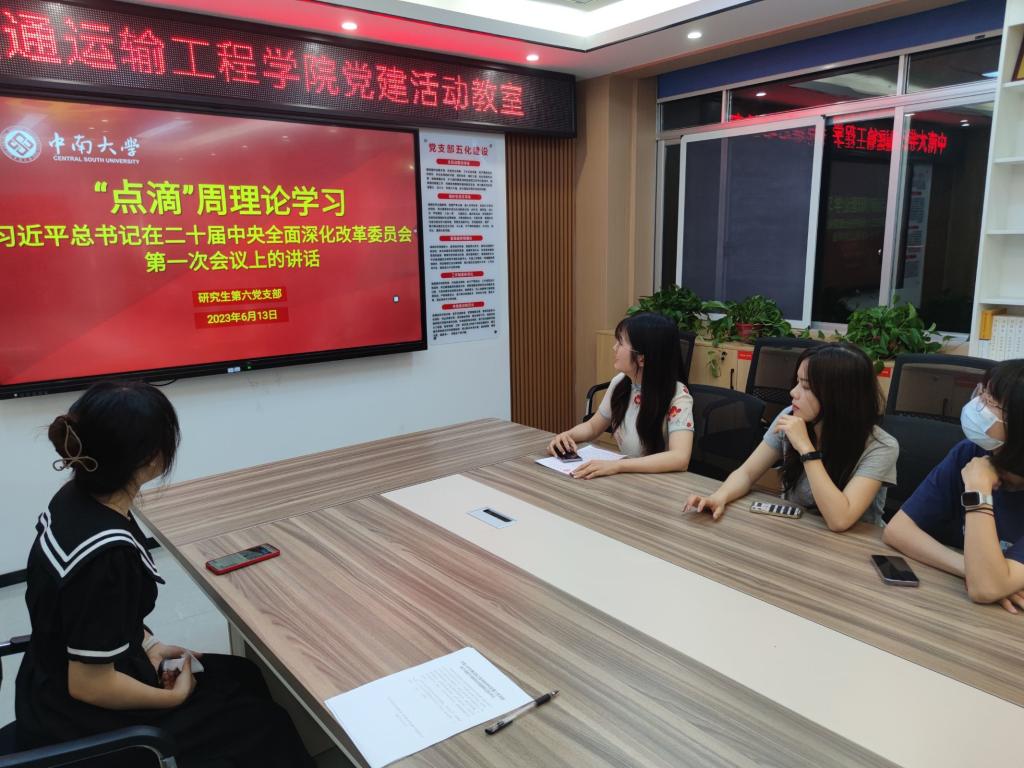 研究生第六党支部第三学习小组的党员同志们在6月13日晚7:00齐聚一堂,共同学习习近平总书记4月21日在中央全面深化改革委员会第一次会议上的重要讲话。会议开始时,第三学习小组组长屠琪涵介绍了本次会议的目的和议程,并向与会者介绍了习近平总书记在中央全面深化改革委员会第一次会议上的重要讲话。