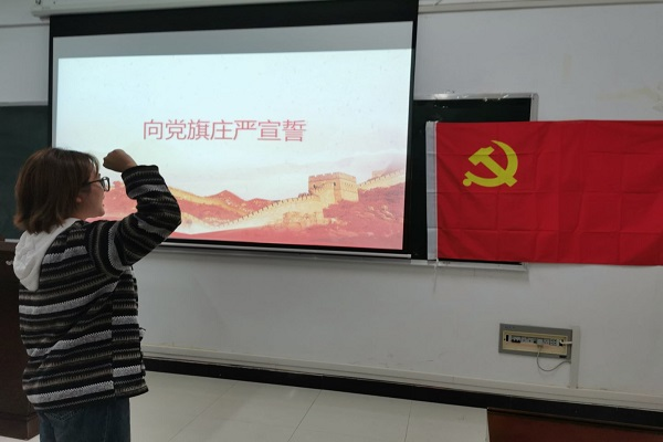 紧接着,支委给各位同志发放精心准备的党员政治生日贺卡,并与同志们一起观看入党时宣誓的照片,贺卡上这样写到:“希望您时刻牢记自己是一名共产党员,注重党性修养,增强党员意识,牢记入党誓词,践行党的宗旨,永葆共产党员的先进本色。”支部书记王羽珊带领全体同志面对党旗庄严宣誓,在场的学生党员再次回忆起入党初心和为共产主义事业奋斗终身的光荣使命。