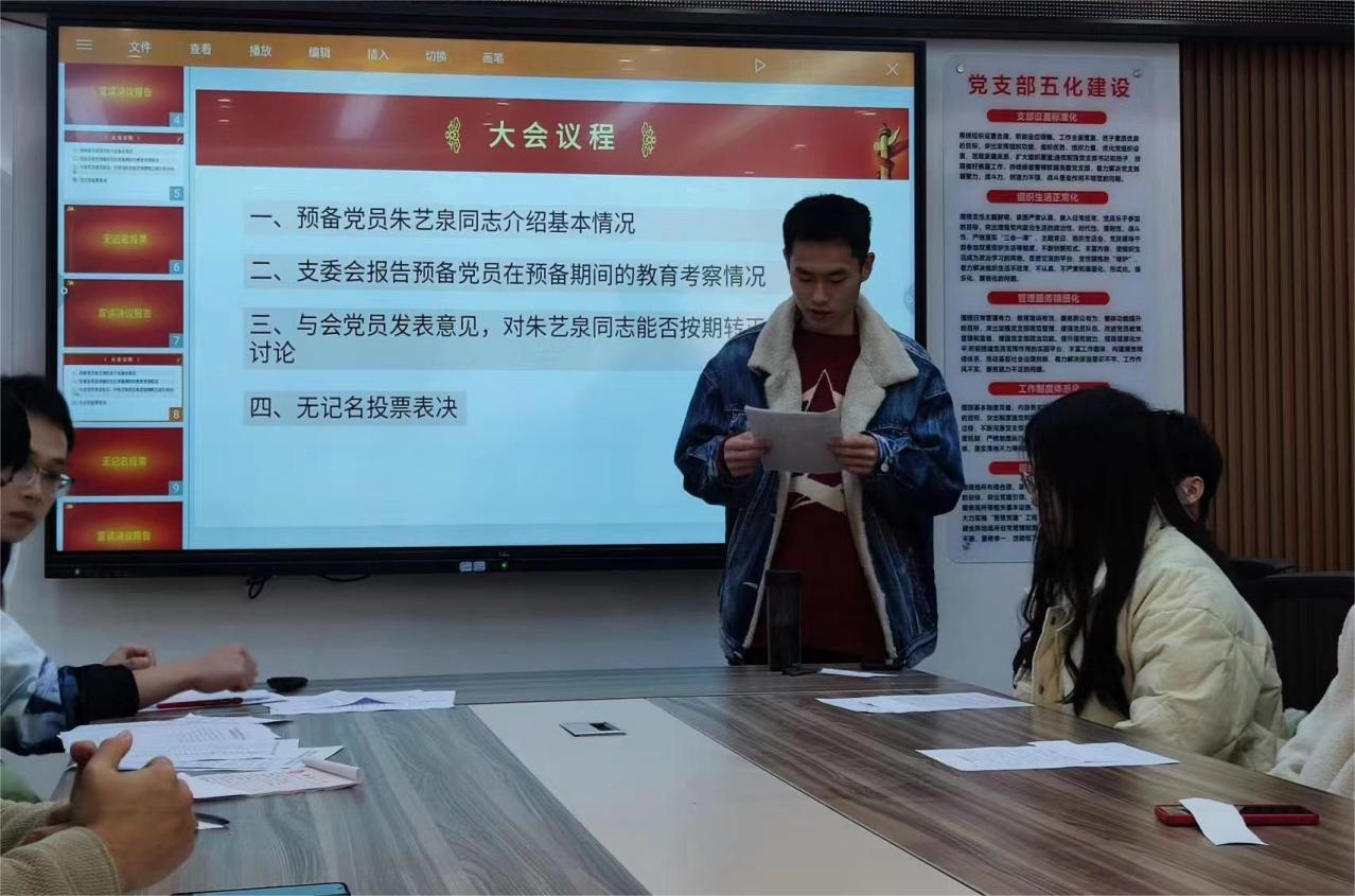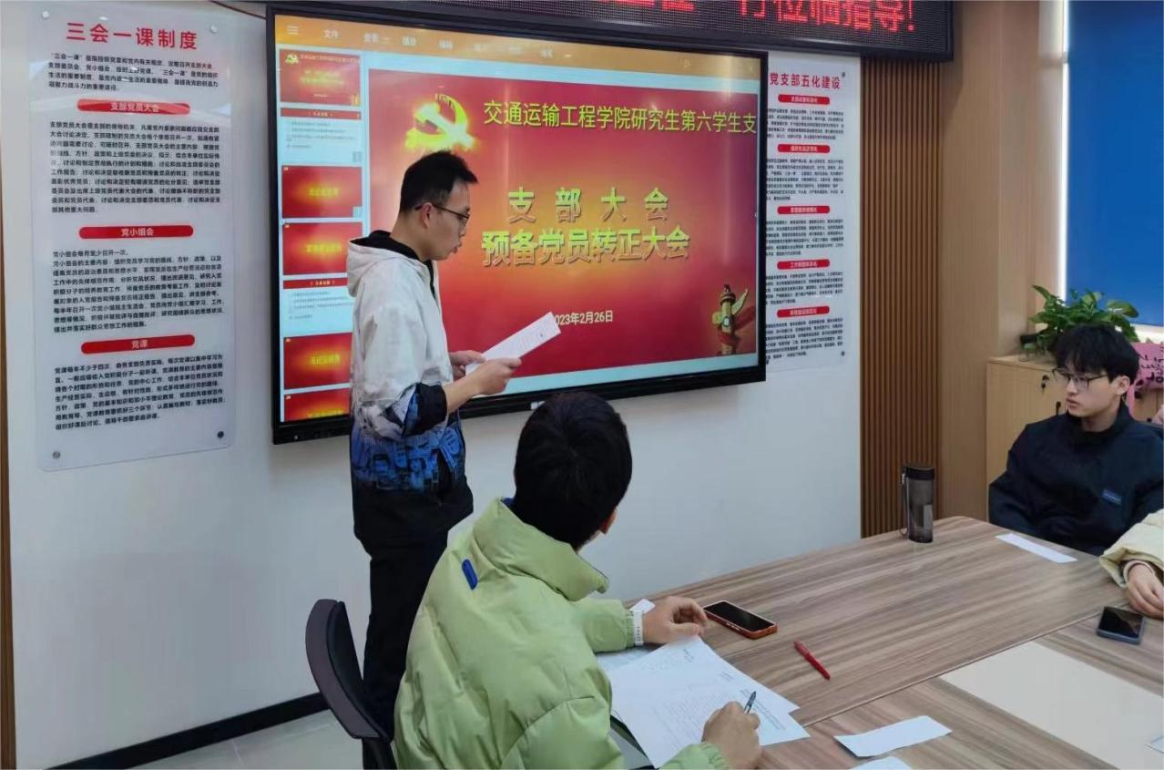 2月26日上午10:00,交通院研究生第六党支部于第一综合教学楼530举行备党员转正大会,讨论预备党员侯睿哲、朱艺泉和胡淦三位同志的转正事宜,会议由党支部组织委员周少宇主持。