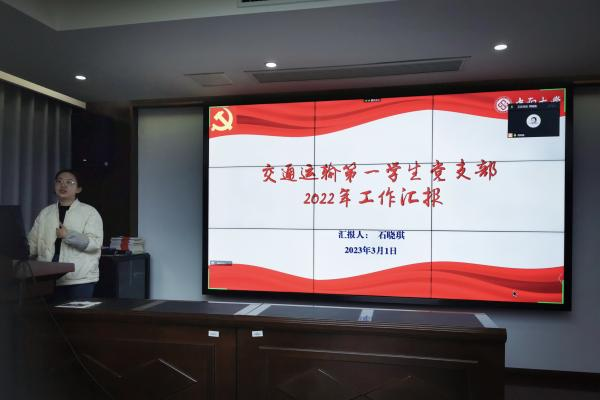 会议伊始,支部书记石晓琪同志代表支部委员会向全体支部党员作《交通运输第一学生党支部2022年党支部书记述职报告》,从讲政治、能作为、乐奉献、查问题四个方面总结了本年度支部工作成果与工作亮点。她指出,2022年支部的各项工作稳步推进,效果良好,保持着长期以来的优良传统,但同时也存在着一些问题,需要全体同志共同整改。