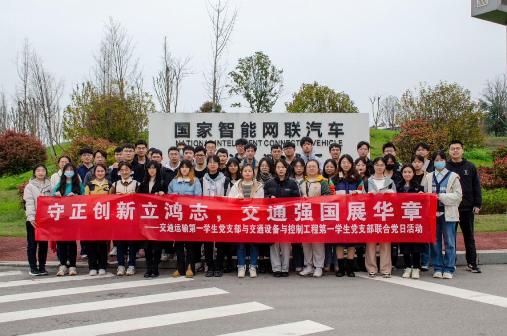 3月29日下午,交通设备与控制工程第一学生党支部与交通运输第一学生党支部,在湘江智能网联产业园联合开展了主题为“守正创新立鸿志,交通强国展华章”的三月党日活动。在郑繁简和石晓琪老师的带领下,支部党员同志和部分入党积极分子前往学习和体验智能网联汽车与智慧交通等新技术新产业。