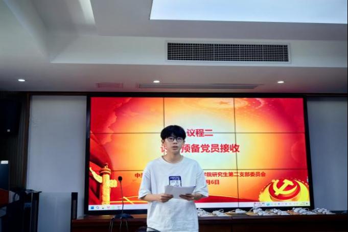 会议第二项,大会讨论禾铸凯、胡俊杰两位同志的预备党员接收工作。两名发展对象首先结合入党志愿书,向大会汇报个人对党的认识、入党动机、本人履历、家庭和社会主要关系情况以及需要向党组织说明的问题。随后,两位发展对象的入党介绍人分别介绍了候选人的日常表现情况,组织委员胡奕同志代表支委会报告审查意见。经支部委员会审查,禾铸凯等两名发展对象能自觉拥护党的路线、方针、政策,政治表现较好,政治历史清楚,直系亲属及主要社会关系拥护党的领导,并且党内外群众对禾铸凯等两名同志的意见均良好。经与会党员充分讨论,推选庞腾达为监票人、闫涛为计票人,以无记名投票全票通过接收决议。最后,支部副书记王耀鹏同志宣读了表决结果:“支部现有党员41名,其中正式党员36名,实到29名,赞成票29张,表决有效,同意接收禾铸凯等两名同志为中共预备党员。”