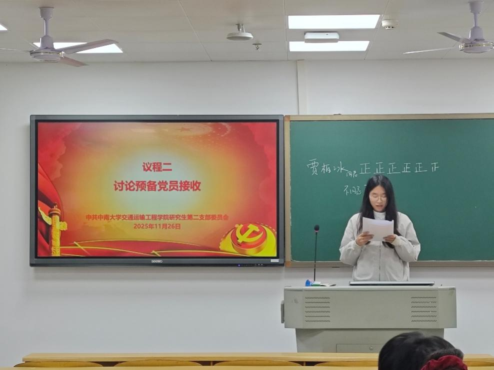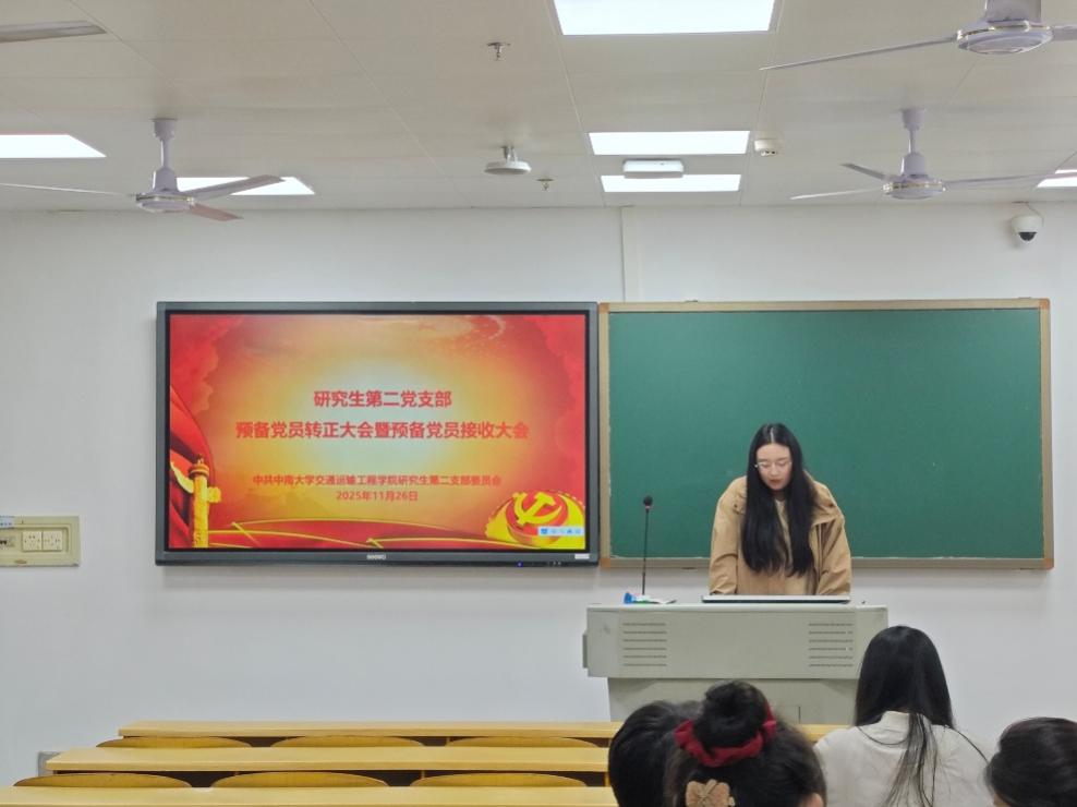 11月26日19:00,研究生第二党支部于世纪楼A105教室举行预备党员接收暨预备党员转正大会。本次会议由支部书记胡奕同志主持,支部全体党员参加会议。本次会议旨在进一步加强支部党员队伍建设,保持党员队伍的先进性和纯洁性,为支部发展注入新的生机与活力。