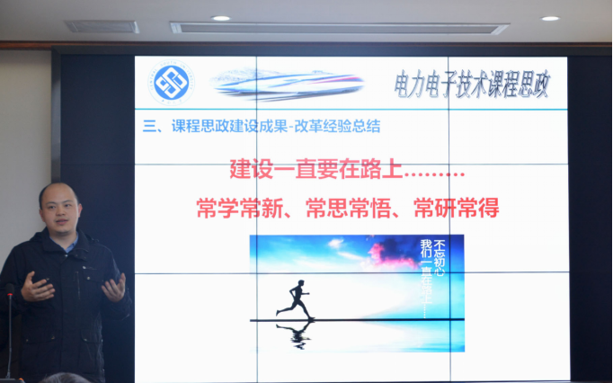 在陈维亚副院长宣布完答辩规则后,答辩环节正式开始。首先是九位教师依次上台代表各自小组进行结题汇报。刘辉教授(图2)在《电力电子技术课程思政》建设过程中得出“改革建设一直在路上,要常学常新、常思常悟、常研常得”。罗意平教授(图3)谈到:“先进制造技术本身就是一个国家发展最重要的领域,他的好坏直接关系到一个国家、一个民族的兴亡。”他们团队在授课时采用翻转课堂的模式,充分发挥学生们的主观能动性,对学生们进行价值塑造,厚植立德树人情怀。教学效果的准确判断会对教学质量起到反馈激励作用,陈维亚教授(图4)在《城市轨道交通运营与服务管理》的教学实践中,总结出了符合隐形化、多样化、共情化三原则的教学效果评价方法。秦进教授(图5)团队则在授课中不断拓展课程内涵,构建出了线上线下结合、理论实践融合、中英文融合的课程体系。
