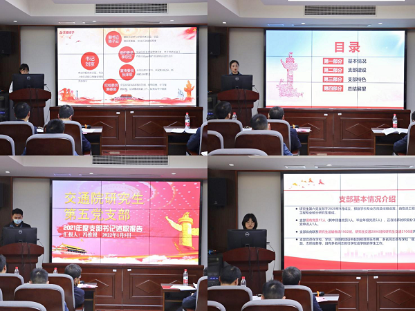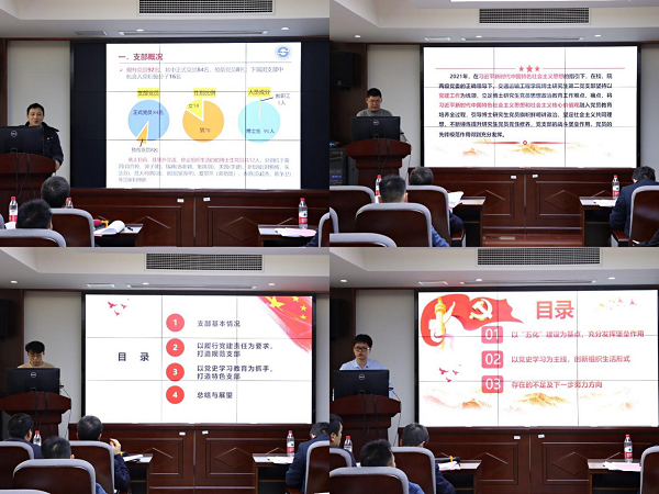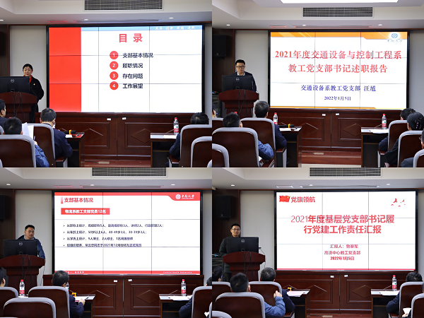 首先由各个支部书记就本年度支部和个人工作进行述职,最先进行汇报的是教职工党支部书记。交通运输系教工党支部、交通设备与控制工程系教工党支部、物流工程系教工党支部、高速列车研究中心教工党支部的4个支部书记分别从支部2021年的基本工作情况、书记的履职情况、教职工党员这一年的科研成果、支部的组织生活等方面都进行了详细介绍,同时也都指出了这一学年在支部建设中存在的问题,以及未来改进的方向。学院党委成员对四个教工党支部进行了点评,在支部建设、党史学习教育等方面都有所进步,但仍然存在先锋模范带头作用还发挥不够的问题,下一步要继续加强。对于高速列车研究中心党支部尤其提出要配合学校做好寒假期间的疫情防控工作。
