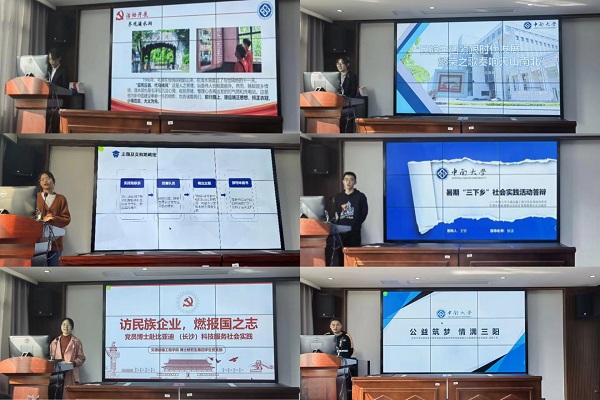庄明宇同学简要介绍会议流程、团队汇报顺序后,总结答辩正式开始。六支实践团代表依次上台汇报,从实践主题、实践背景、实践目的、前期准备、实践内容、宣传工作、总结反思等方面详细介绍了团队的实践开展情况,并分享了他们在活动中的思考与收获。梁春月分享了团队在香花镇为孩子们开展趣味课程、体检、运动会等特色活动的营养支教历程;张文璐讲述了党员博士团走进民族企业比亚迪的所见所感,并由衷产生了高校发展要注重校企联合,高校学子要立志报国的远大情怀;李辰辰从团队赴湘潭进行党史学习的经历出发,阐述了团队宣讲百年建党历史和红色精神的成果和收获;付智俐分享了团队深入南山水西沟镇小东沟村以及沙区雅山管委会校园社区的实习经历,为现场与会人员展示了少数民族地区在新时代发生的可喜变化;王钦结合团队在小东沟村和渠阳镇的调研经历,总结了乡村振兴战略为农业农村带来的深刻变化;莫凯程所在团队开展的爱心公益活动为本地儿童带来了快乐与成长,获得了积极反响。各实践团向社会展现了中南学子的责任与担当,弘扬了昂扬向善、乐于助人的美好品质。评委们充分肯定了各实践团取得的优异成果,并对他们存在的不足之处提出了中肯的建议,各队伍认真学习,受益匪浅。