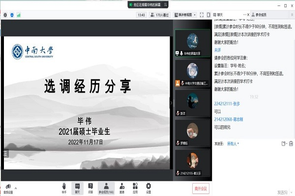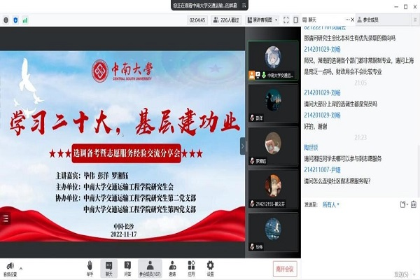 研究生会主办,研究生第二、第四党支部联合协办,邀请2017级硕士研究生彭洋、2018级硕士研究生毕伟及优秀青年志愿者罗湘钰主讲。220余名同学通过线上平台积极参与活动,同学们在学习理论知识、汲取备考经验的同时,热烈讨论大学生应该如何参与志愿服务活动、力所能及服务社会。