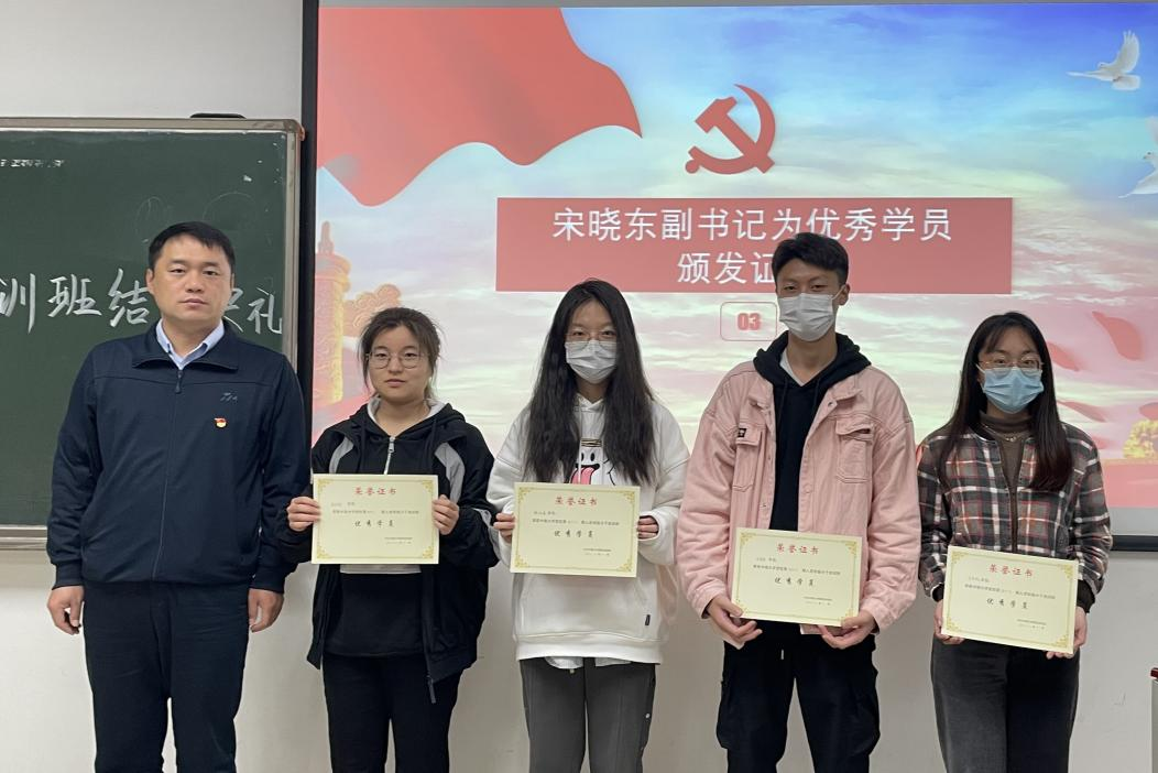 典礼伊始,全体起立,奏唱国歌。接着,张佳琪老师宣读表彰决定,评选张铭宜等4名同学为本次培训班优秀学员。宋晓东副书记为优秀学员颁发证书并合影留念。