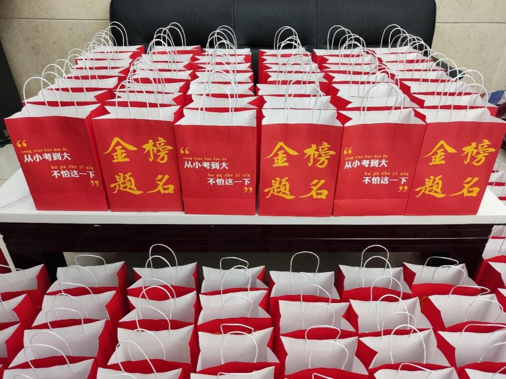 21号下午,一份份满载祝愿的福袋整齐地摆放于交通楼大厅,福袋内包含有寓意成功上岸、逢考必过的定制书签,象征牛气冲天的牛奶、补充能量的巧克力,以及较为实用的口罩、暖宝宝等日常用品。