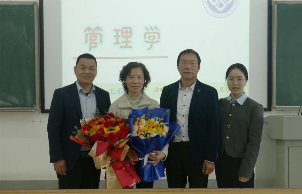 第一节课刚结束,陈维亚副院长、“管理学”新任课程负责人毛成辉老师、研究生助教等捧着鲜花进入教室,为方晓平教授举办了一场简短而又温馨的“最后一课”献礼仪式。陈维亚副院长代表学院为方晓平教授献上鲜花,感谢其数十年如一日为教育教学事业辛勤耕耘,带领“管理学”课程团队积极建设课程,始终贡献有温度的课堂,并对方晓平教授致以美好地祝愿。