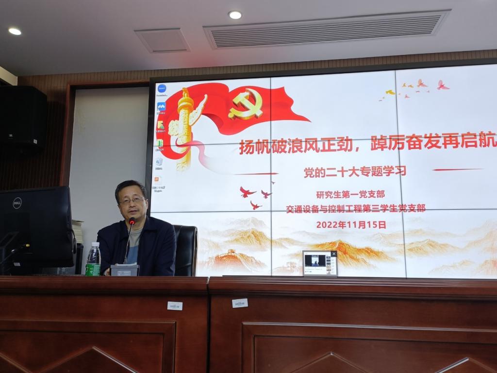 为深入学习贯彻党的二十大精神,加强支部党员政治理论学习,11月15日晚19点,同人动漫 党委书记贺志军于交通楼425为研究生第一党支部、交通设备与控制工程第三学生党支部全体党员讲授《党的二十大精神解读》专题学习党课,本次党课由研究生第一党支部书记刘家忱同志主持。