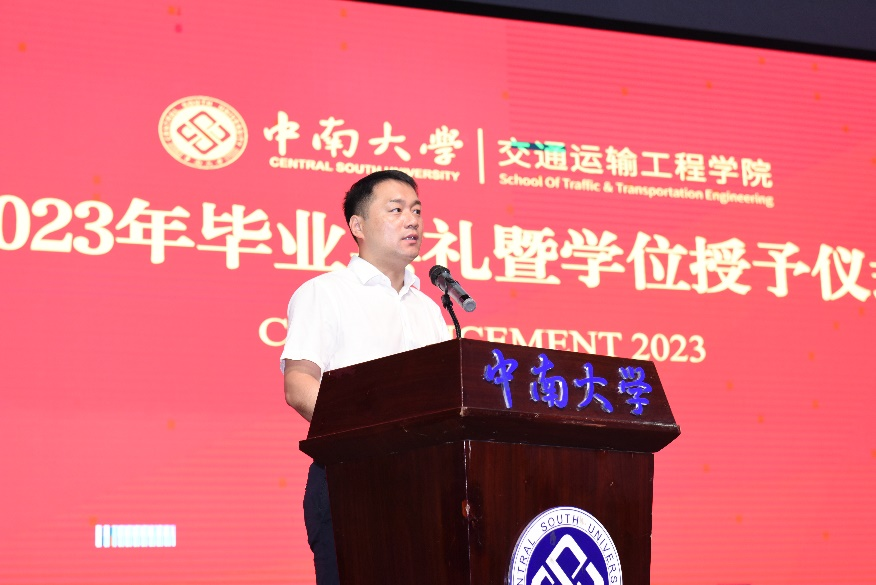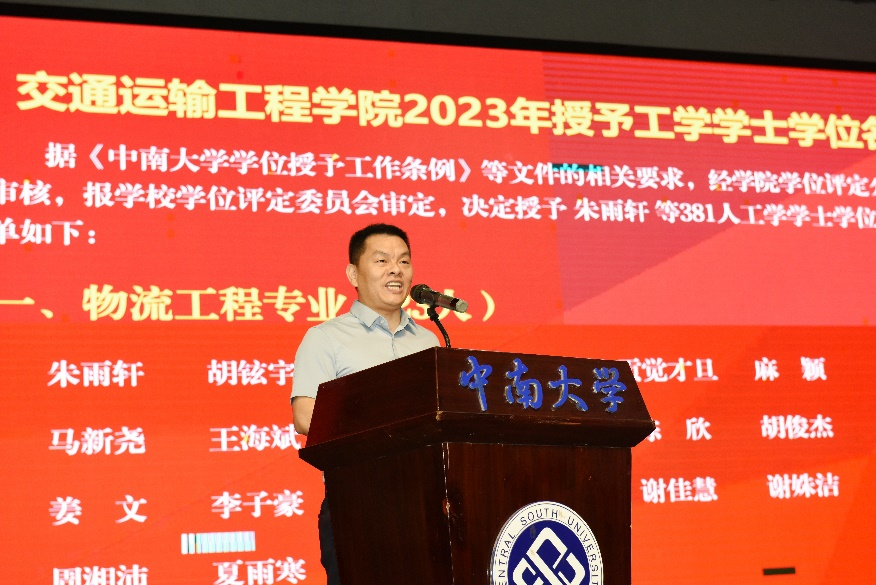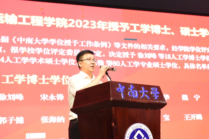 典礼在庄严的国歌声中开始。交通院副院长彭勇宣布2023年授予工学博士和硕士学位名单,副院长陈维亚宣布学士学位学生名单。在本届毕业生中,18人获工学博士学位、44人获学术硕士学位、85人获专业硕士学位、381人获工学学士学位。