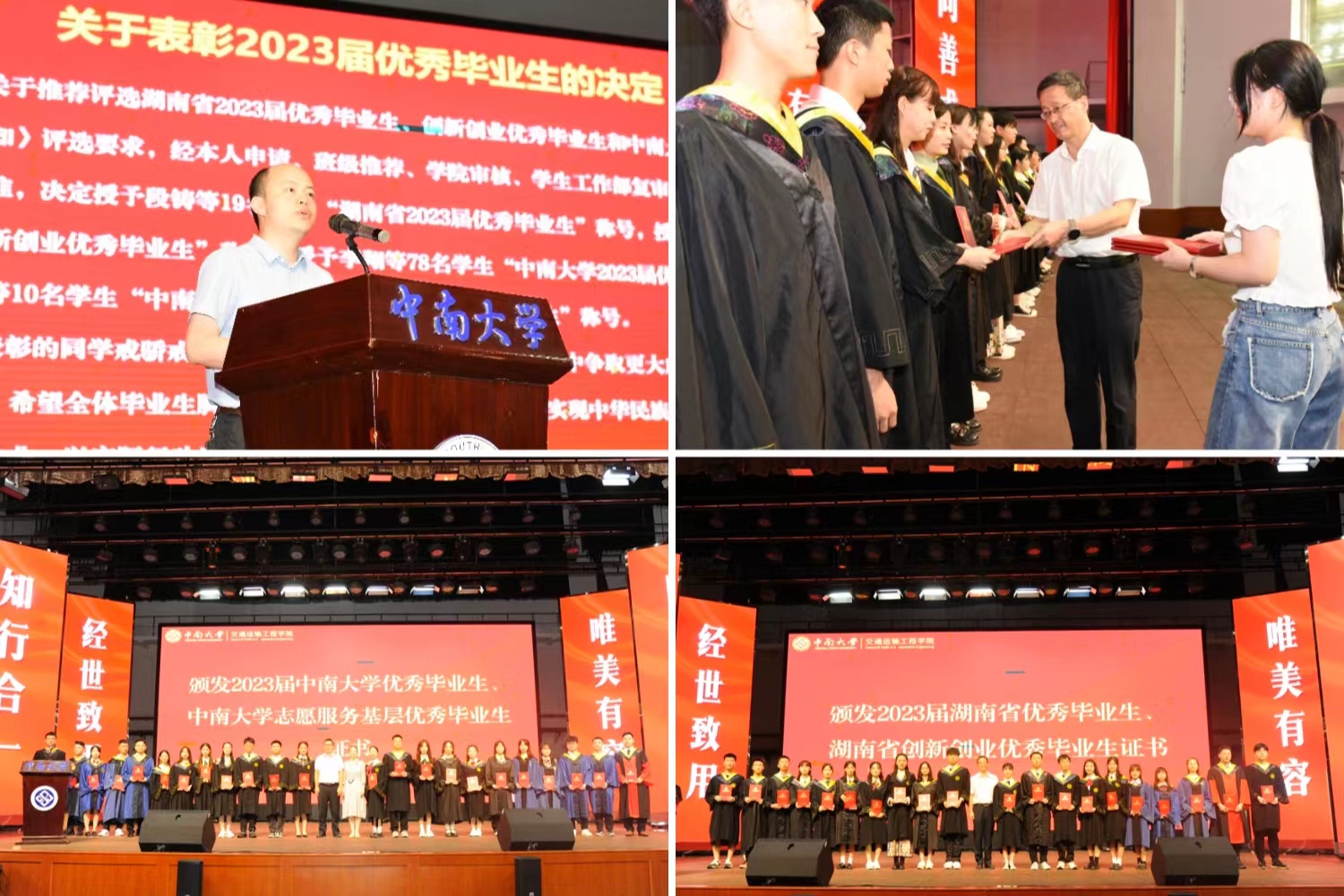 毕业生名单宣读完毕后,副院长刘辉宣读《关于表彰2023届优秀毕业生的决定》,并宣读湖南省2023届优秀毕业生、湖南省2023届创新创业优秀毕业生、同人动漫 2023届优秀毕业生、同人动漫 2023届志愿服务基层优秀毕业生名单。院党委书记贺志军为湖南省优秀毕业生、湖南省创新创业优秀毕业生颁发荣誉证书,副院长张英贵、韩锟为同人动漫 优秀毕业生、同人动漫 志愿服务基层优秀毕业生颁发荣誉证书。