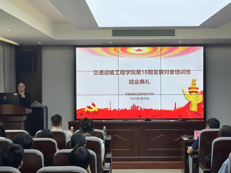 朱爱媛代表培训班全体学员发言。她表示,在二十多天的培训中,除课堂理论知识学习外,同学们还前往了铁路园等党性教育基地进行社会实践,不仅深化了对党的认识,同时也坚定了加入共产党的决心。她号召同学们,作为一名发展对象,同时身为一名交通学子,需始终牢记身上的使命担当,努力学习先进文化,以科学知识武装自身,将小我融入大我,以自身的实际行动践行习近平新时代中国特色社会主义思想,为交通强国贡献力量,让青春在全面建设社会主义现代化国家的火热实践中绽放绚丽之花。