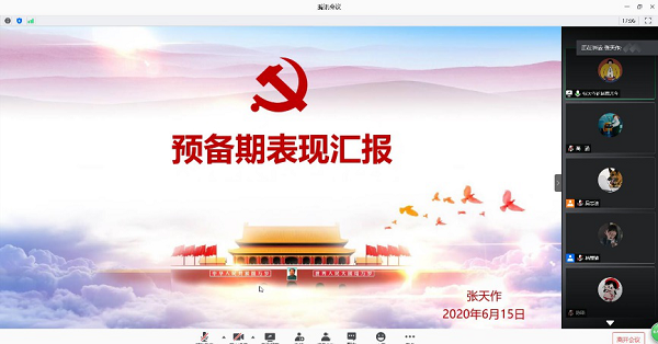 6月15日下午三点,交通院研究生第一党支部通过腾讯会议召开2020年上半年党员大会。会议主要议程分为讨论张天作、闫红莹两位预备党员同志的转正问题以及集中学习全国“两会”精神两个部分。支部应到52人,请假11人,实到人数41人,其中具有表决权的党员有35人,超过半数,符合预备党员转正程序。此次会议由支部书记杨蕙瑜同志主持。