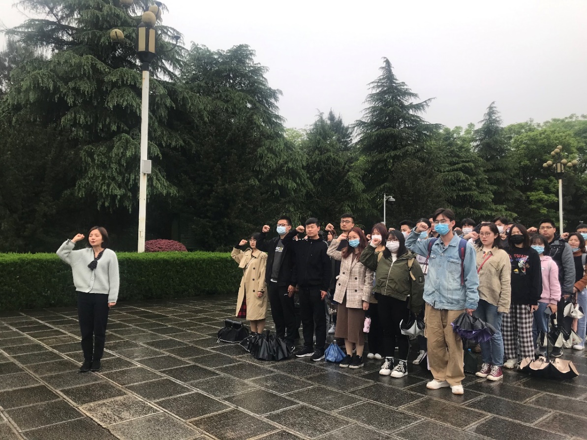 首先,全体成员在铜像广场集合。广场中央伫立着刘少奇铜像,让人肃然起敬。在张佳琪老师的带领下,三个党支部的党员一齐宣读了入党誓词,表达了始终捍卫中国共产党的坚定意志与决心。