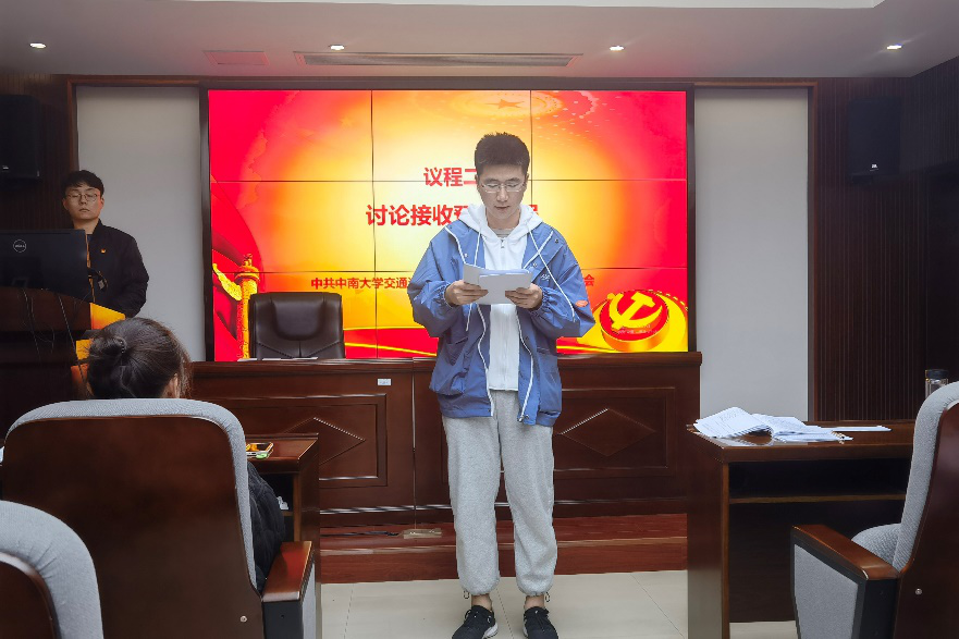 会议伊始,支部全体成员起立,奏唱国歌。随后,支部书记蔡明旭同志介绍了会议的流程及要求,支部大会首先讨论接收预备党员相关事宜。陈艳琴、易杜涵、康静、李小杰、黄钰钧五位发展对象依次上台宣读《入党志愿书》,并详细介绍其个人基本情况、对党的认识的转变历程、入党动机以及理论知识学习情况。