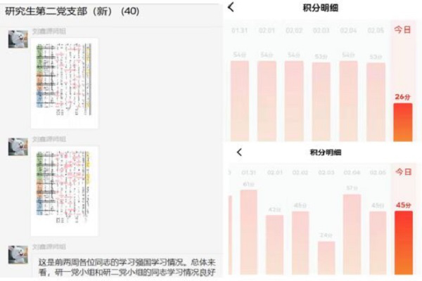 假期中,支部各位同志在每周日将本周的学习积分情况截图发送到支部群,由支部纪检委员刘鑫源同志进行积分统计。在1月31日至2月6日这周,研三党小组共17人平均分191,研二党小组共11人平均分244,研一党小组共11人平均分高达260,该周支部累计总分8782。