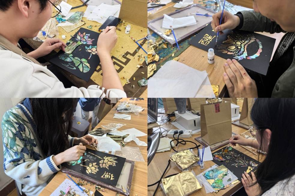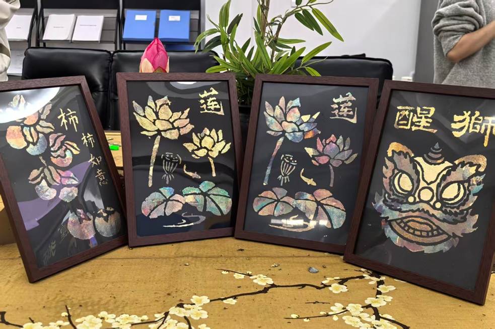 在制作过程中,同志们还从老师的讲述中了解到,烧箔工艺不仅存在于传统艺术品中,如今已经融入了现代生活的方方面面。从新中式马面裙上熠熠生辉的金属肌理装饰,到美甲艺术中璀璨夺目的华丽点缀,从非遗手机壳到各类文创产品,这门古老的技艺正以崭新的面貌走进年轻人的世界。烧箔独有的金属肌理感,配合各异的图案,也让大家切身感受到了中式美学所蕴含的质朴优雅,传统文化在现代审美中焕发新的生机。这正是传承与创新的结合,也是文化自信的生动体现。