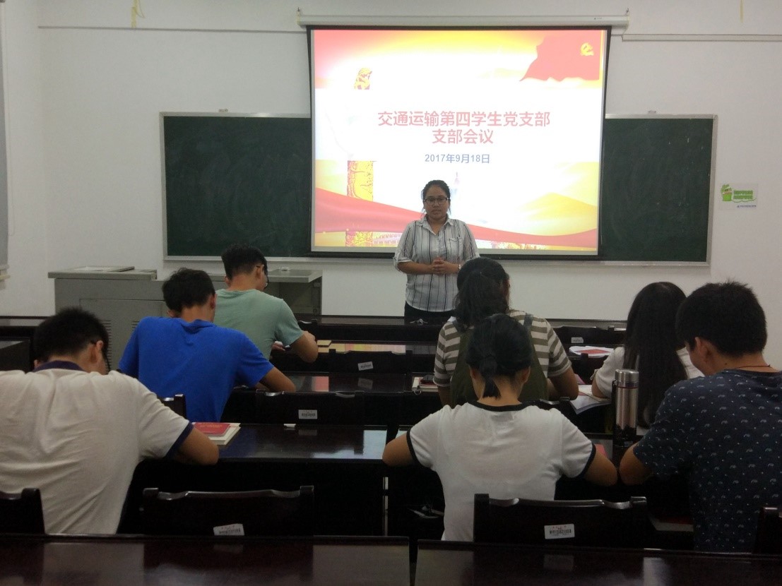 9月18日晚九点,交通运输第四学生党支部在交通楼515举行专题民主生活会,会上支部成员对照《高校党建工作标准》,积极开展批评与自我批评,支部书记侯君红同志对支部新学期的各项工作做出了安排和部署,交通运输第四学生党支部全体党员参加。