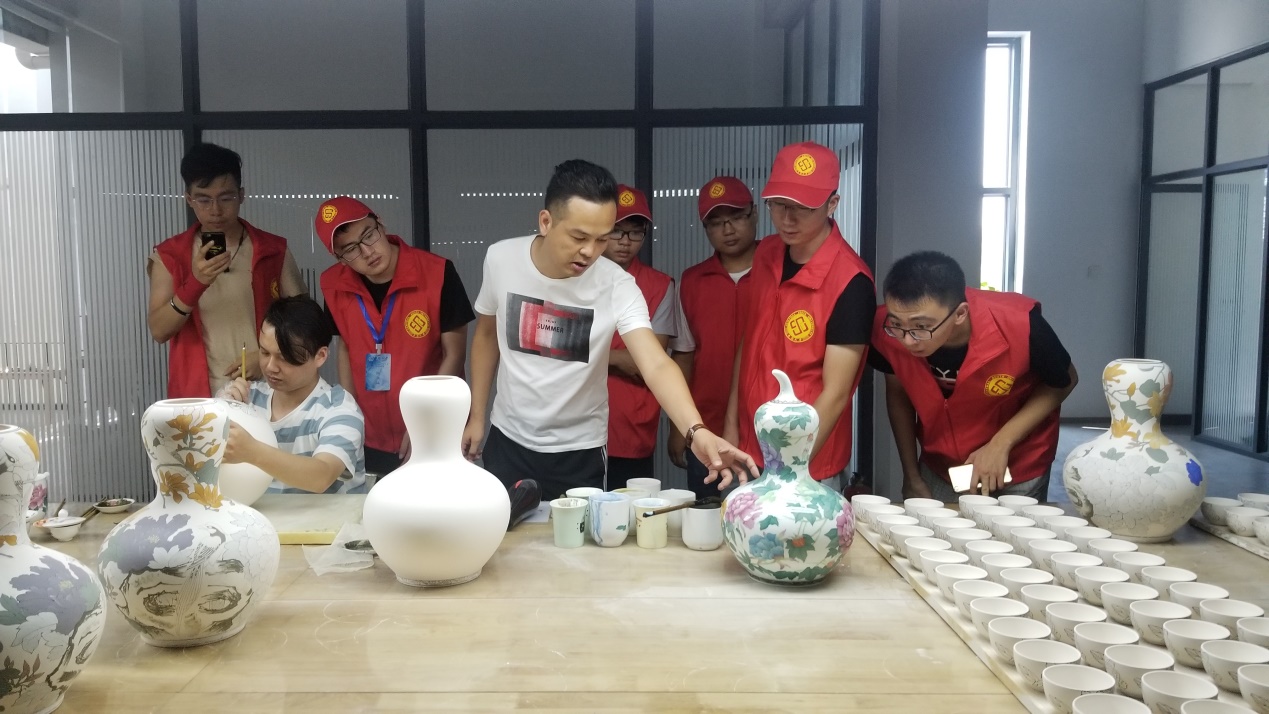 之后我们来到了醴陵尚方窑瓷业有限公司的生产车间,负责人漆总带我们参观了醴陵釉下彩陶瓷的生产流程。尚方窑公司主打高端陶瓷产品,80%以上的生产流程是由技术人员手工完成。据了解,这些技术人员一坐就是一整天,勾画中每一笔都有讲究,每一件作品的完成都需要历经万道工序的打磨,这也正是匠人精神的体现。但是漆总告诉我们,虽然醴陵已经组建了陶瓷技术职业学校,但是现在愿意从事这种枯燥单调工作的年轻人已经不多了,他们这个行业正面临着严重人才危机。