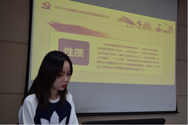 紧接着,部长游弋介绍了分党校管理部的工作性质及内容简介。她总结分党校管理部的性质和主要工作为“一个核心,两个重点,三个常规工作”。她还介绍了不同部门的具体职能与工作内容,从团队建设出发介绍了分党校管理部学习与工作兼顾、认真勤勉、相互督促、共同进步的部门风气。