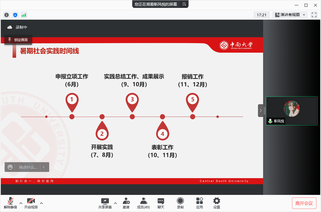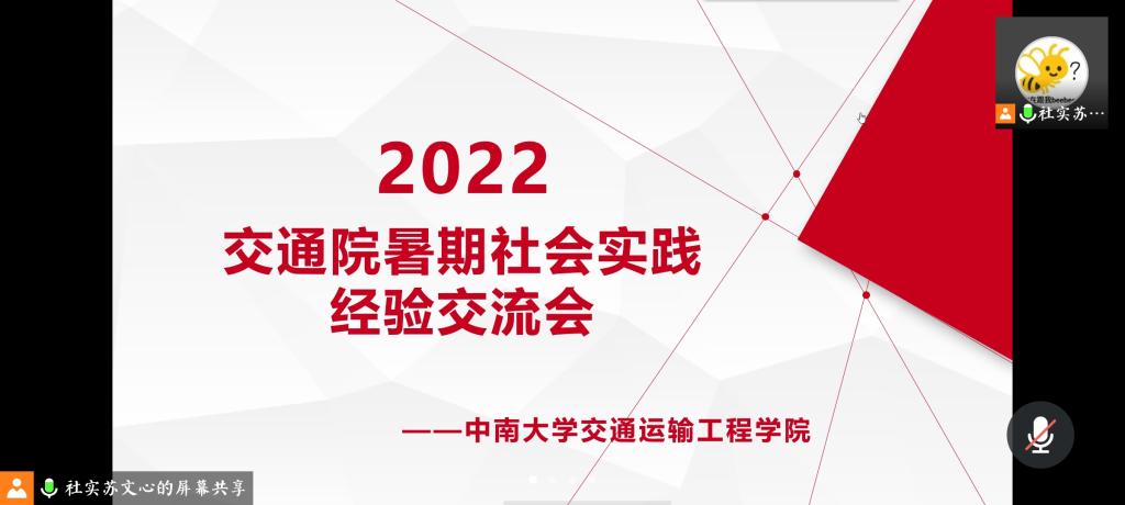 2022年暑期社会实践经验分享会在线上顺利举行。部分本科20级、21级学生参加了本次会议。本次会议邀请了交运1801班靳凤悦、物流1901班胡铉宇和交运1802班游弋三位在往年暑期社会实践中表现优异的同学向大家分享经验。会议由苏文心同学主持。