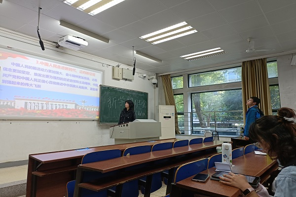 随后,班长以量子号游轮和军用武器的高速发展等案例为引,指出实施科教兴国战略的重要意义。班会最后,两位同学分享了在二十大学习中感触最深的内容。