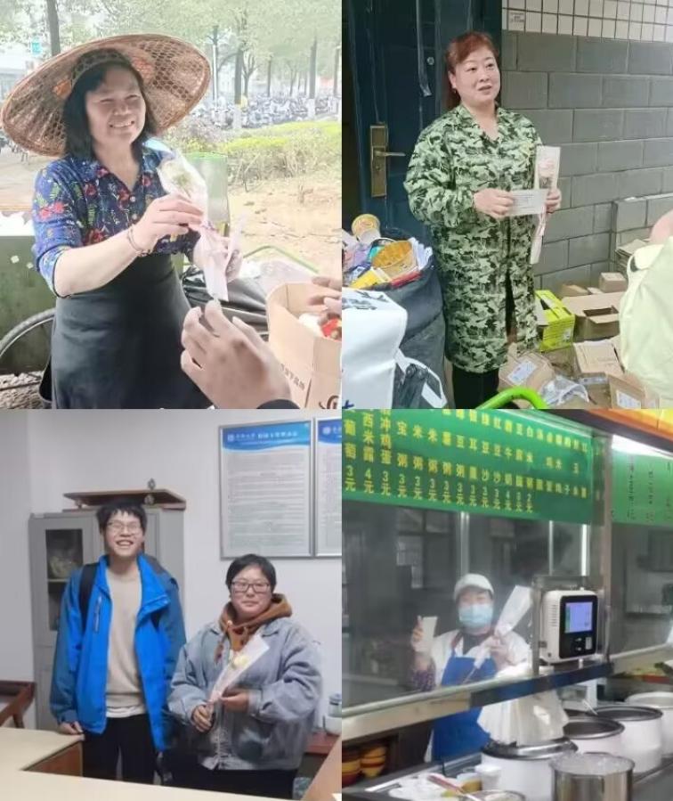 下午14:00,交运2101班和交运2102班的同学们走进食堂、宿舍值班室、学校清洁站、辅导员办公室,将早早准备好的鲜花与贺卡赠与她们,为她们送上节日的祝福。