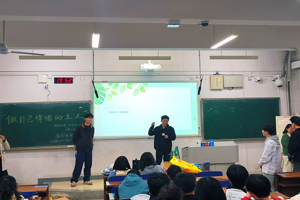 随后,交控2102班心委林武铉讲述了情绪的分类,引入经典的视觉错觉图来论证“看问题的角度不同,结果也会不一样”的结论,并讲解了情绪ABC理论、作用和实际运用。接着,同学们进行“一决高下”小游戏,积极发掘每个人身上的亮点。林武炫表示要多元化地看待自己的大学生活,尽可能多地发现自身的闪光点和竞争力。