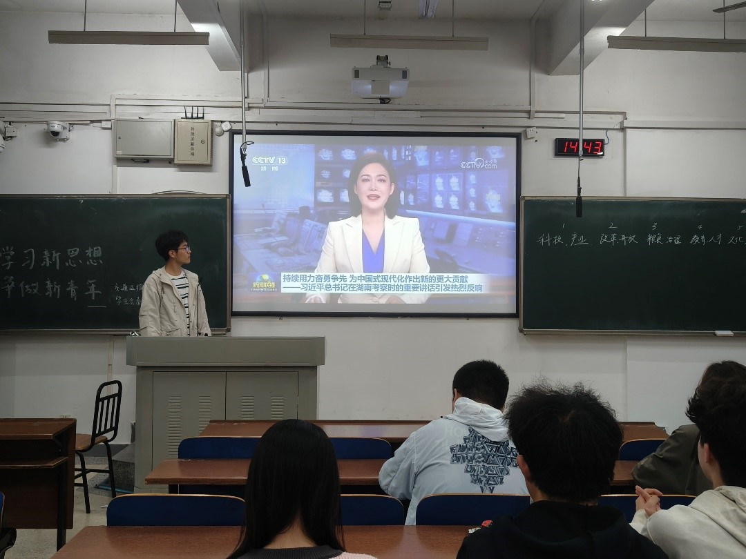 会议伊始,由学生会主席吉文韬作为主讲人,与会成员共同进行了理论制度学习培训。首先以习近平总书记在湖南考察专题学习为开头,深入挖掘习近平总书记在湖南第一师范考察时的重要讲话内涵、解读《在中国式现代化建设中谱写中部地区崛起新篇章》相关内容,由科技创新引领产业创新引申到创新能力对大学生的重要性。