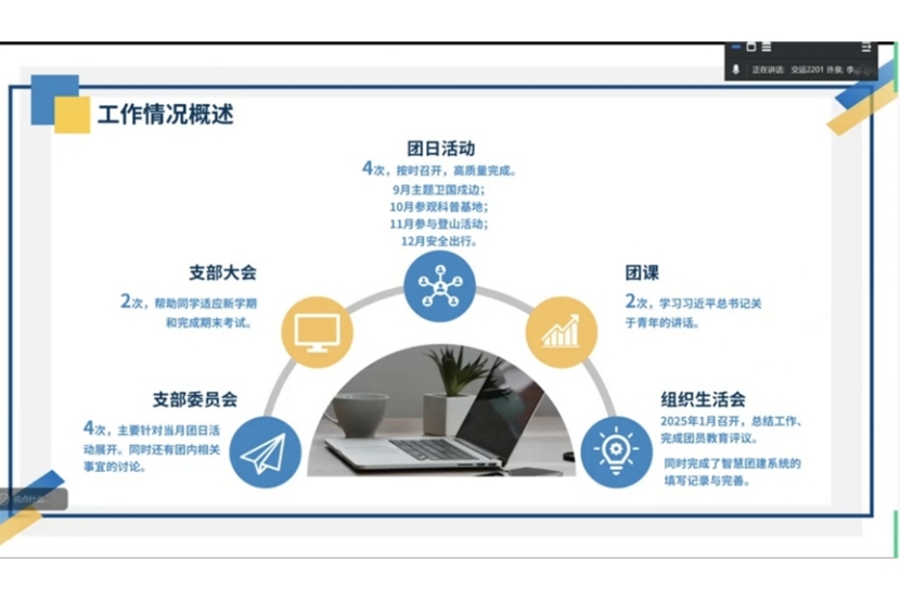 随后,参会团支书依次进行述职汇报。汇报从支部概况,上学期工作成效,工作中的不足以及本学期工作计划等方面展开。