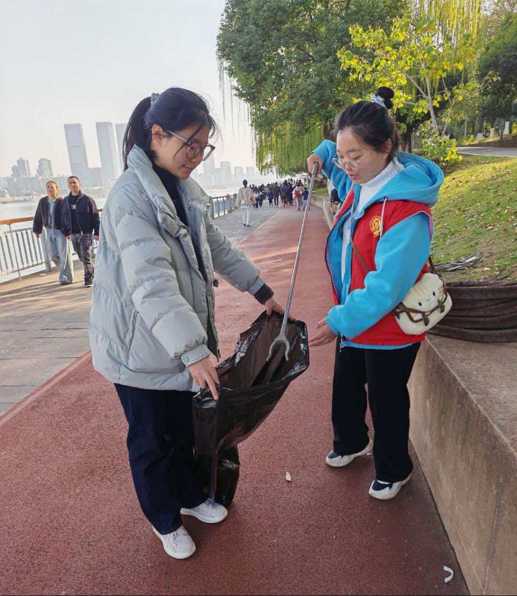 本次活动得到学院学子积极响应,志愿者们身着红色志愿马甲,携带环保夹、垃圾袋等工具在景区游客中心集合后,有序前往湘江岸道开展清理工作。活动中,志愿者们分工协作,重点对岸道沿线、绿化带、石缝及栏杆周边的烟蒂、纸屑、塑料碎片等垃圾进行全面捡拾。大家细致排查每一处卫生死角,弯腰身清理各类废弃物,经过两个多小时的忙碌,累计收集各类垃圾数袋,让湘江岸道环境得到明显改善。
