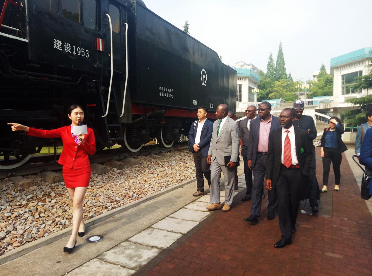 首先,铁路园党建基地讲解员刘洋同学将尼日利亚艾哈迈德贝洛大学代表团一行引导至铁路园机车处,并表示热烈欢迎。刘洋同学先对铁路园三台机车的位置、建设时间、动力来源、枕木区别、入园时间等方面进行总介绍。