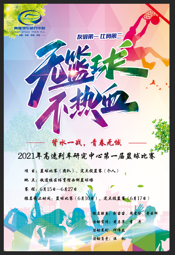 为丰富高速列车研究中心师生员工科研学习工作之余的生活,带动体育活动风气,增进实验室师生间的相处与交流,激发团队工作热情和拼搏创新的能力,特此举办一场面向高速列车研究中心全体师生员工的篮球比赛活动。