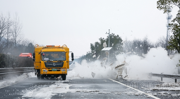 杭瑞高速公路洞庭大桥桥梁结构特殊,桥面不能采用传统撒布融雪剂方式进行作业。湖南高速公路集团岳阳分公司采用滚刷机对路面松软部分的雪花进行清扫,然后用狂风吹雪车进行融冰,狂风吹雪车最高温度可达400多摄氏度,除雪效率提高5倍。