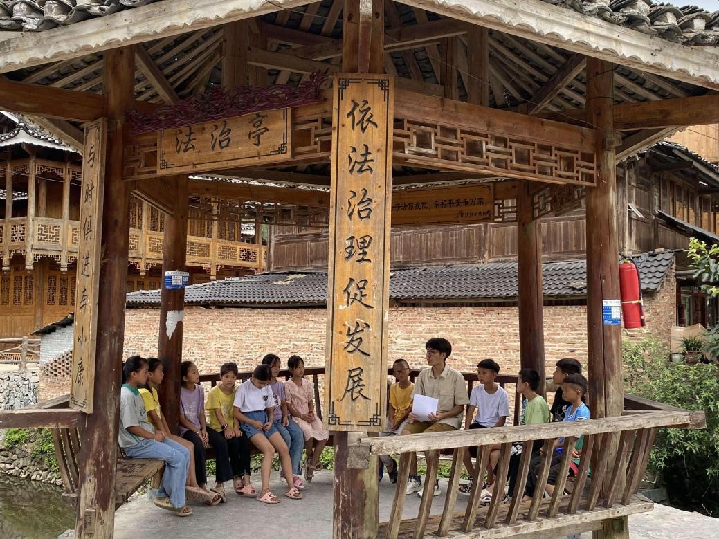首先,支教团成员吉文韬带领孩子们来到苗兰村“法治亭”,开展了一堂道德与法治实践课。通过道德与法治小故事,吉文韬引入“法治”的概念,带领孩子们认识学习社会主义核心价值观,同时,吉文韬结合苗兰村实际,引导孩子们遵守交通规则、保护水源、爱护动植物。