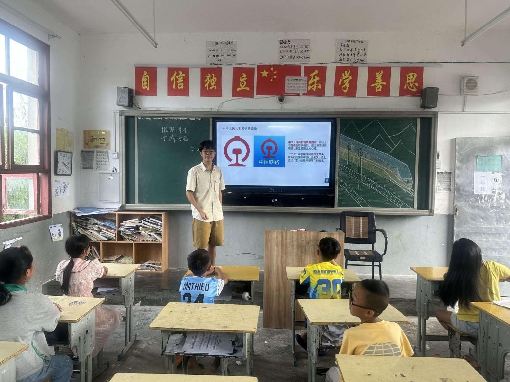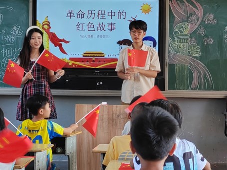 随后,吉文韬从典型的革命故事、革命英雄、革命圣地等方面入手,讲授了红色专题课;支教团成员魏斯佳则开展了“两弹一星”精神、井冈山精神专题课,她引入生活中的应用,生动形象地向孩子们讲解了“核工业”等专业术语,并通过视频介绍英雄事迹,总结了“两弹一星”精神、井冈山精神的基本内涵。在两位支教团成员的共同引导下,孩子们对“党、团、队”的关系有了更为清晰的认知。
