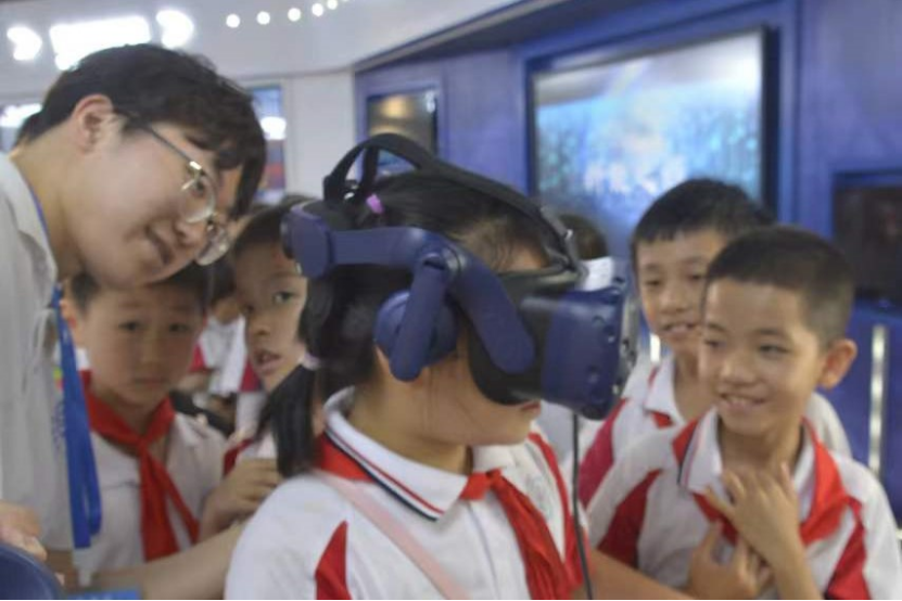 先进轨道交通科普基地的科普馆,志愿者李熠、江居瀚、彭程通过科普馆内特有的飞屏、触摸关联屏和VR互动等多种科普展示技术向队员们展示了轨道交通的基础知识与前沿科技,帮助队员们进一步了解轨道交通知识。在VR互动体验区,队员们体验了地铁车站场景,对地铁站的设施、车内零部件、车辆组成等有了更加具象化的认识。