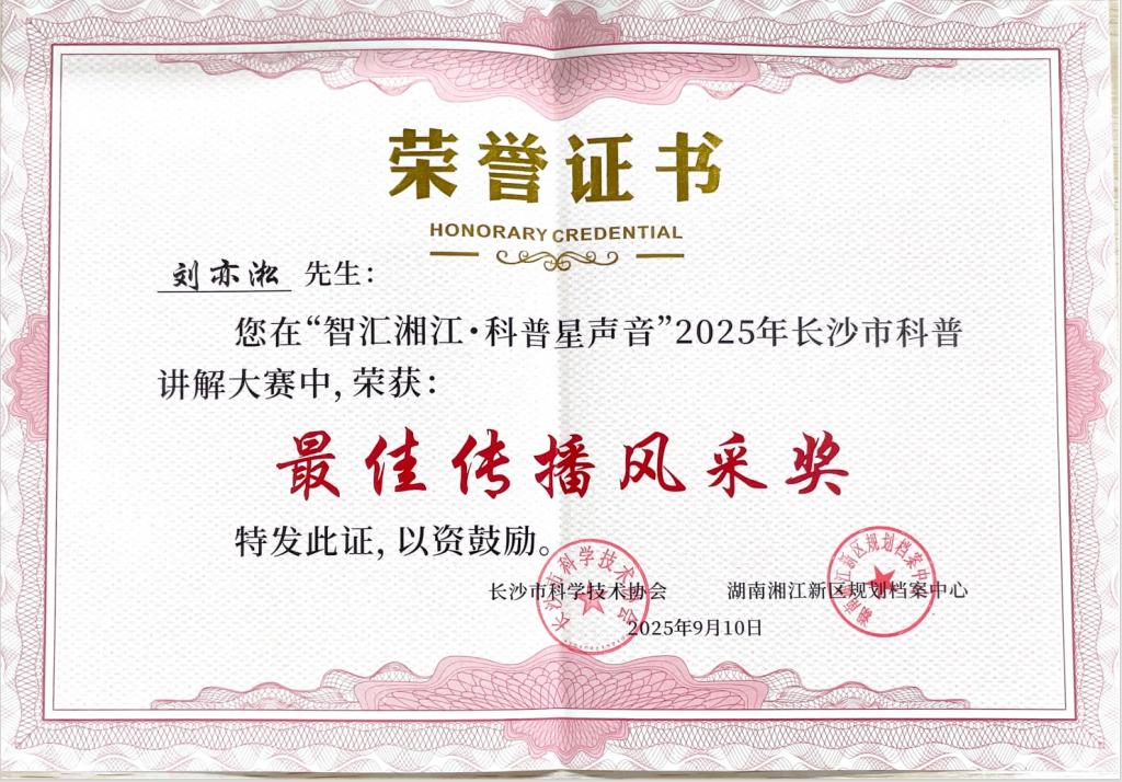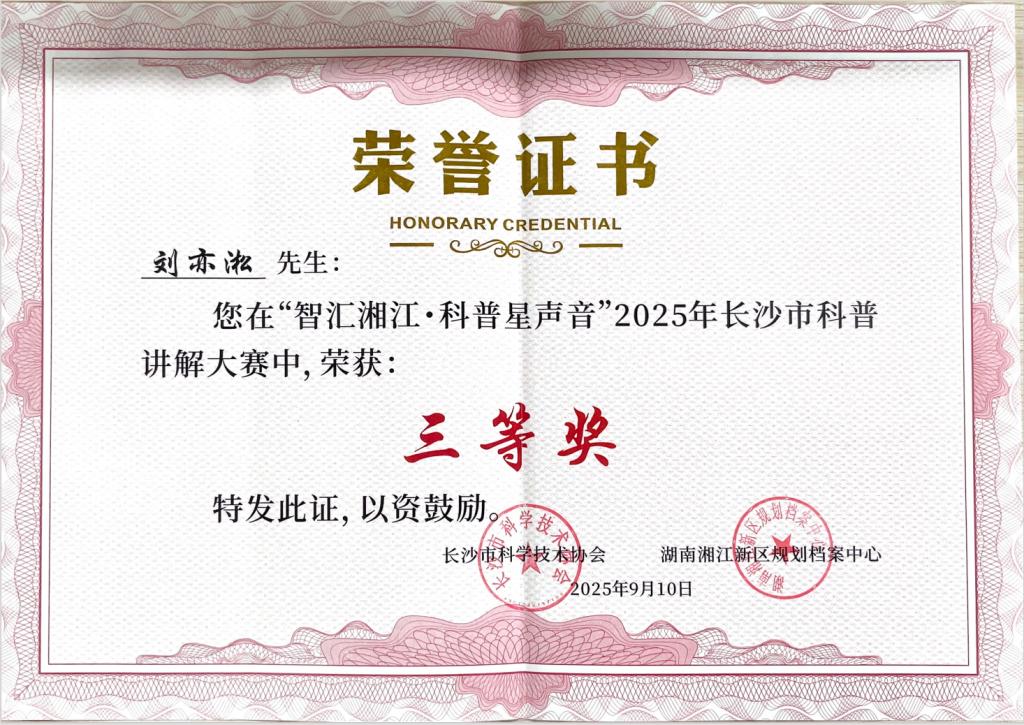 据胡文华报:我基地的科普讲解员刘亦淞先生在长沙市科学技术协会举办的“智汇湘江·科普星声音”2025年长沙科普讲解大赛中荣获“三等奖”和“最佳传播风采奖”。